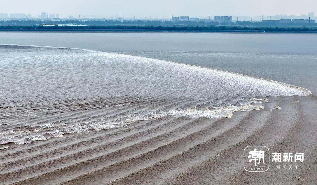 极目远眺,只见远处潮水如万马奔腾般汹涌而来,潮头高度约达1.1米,宛如一堵巍峨的水墙矗立在海天之间。