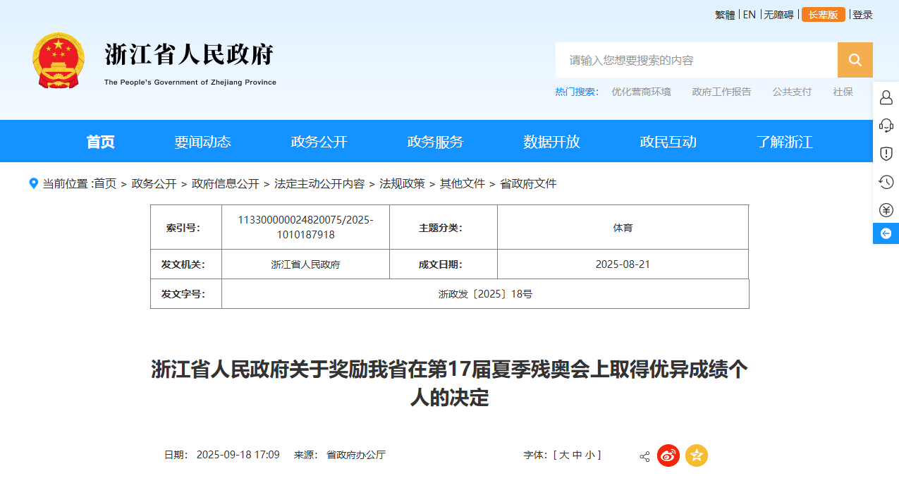 近日,浙江省人民政府印发《关于奖励我省在第17届夏季残奥会上取得优异成绩个人的决定》。