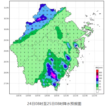 降水实况:23日07时至24日07时,全省面雨量23毫米,市面雨量最大温州60毫米,有7个县(市、区)面雨量超过50毫米,3个超过100毫米,较大有文成153毫米、青田129毫米、瑞安100毫米,累计雨量有72个乡镇(街道)超过100毫米,其中23个超过200毫米,最大文成玉壶林龙449毫米,小时雨强最大宁海望府楼82毫米。另外,昨天浙中南沿海海面出现8~9级大风。
