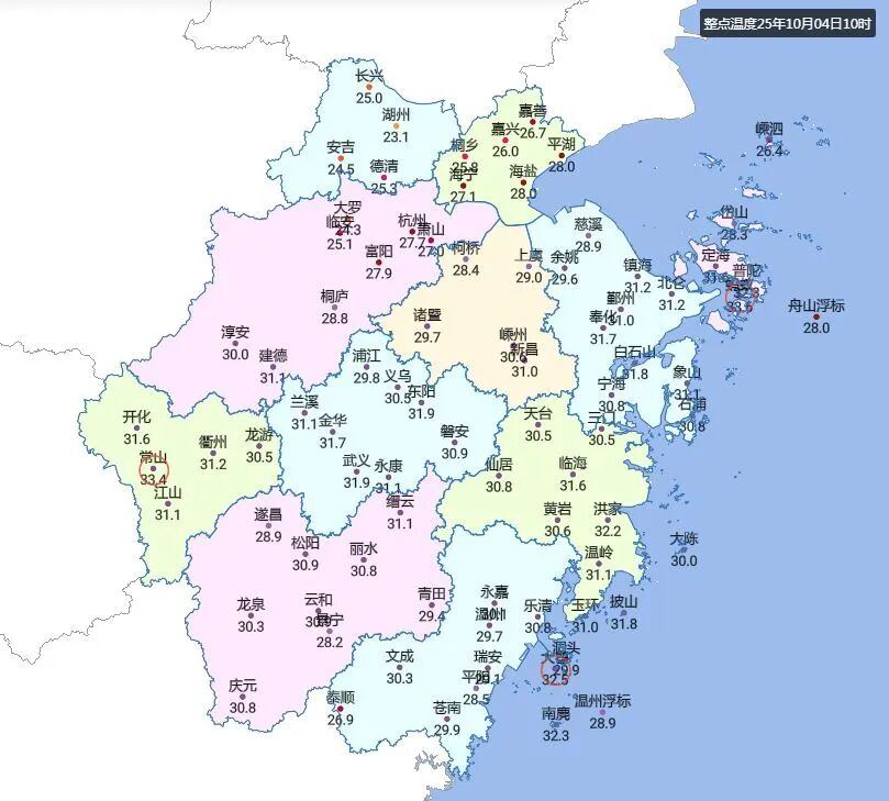 今日10点气温,浙江“南北冰火两重天”,浙中南代表队常山33.4℃,浙北代表队湖州仅23.1℃,一冷一热最大相差10.3℃。