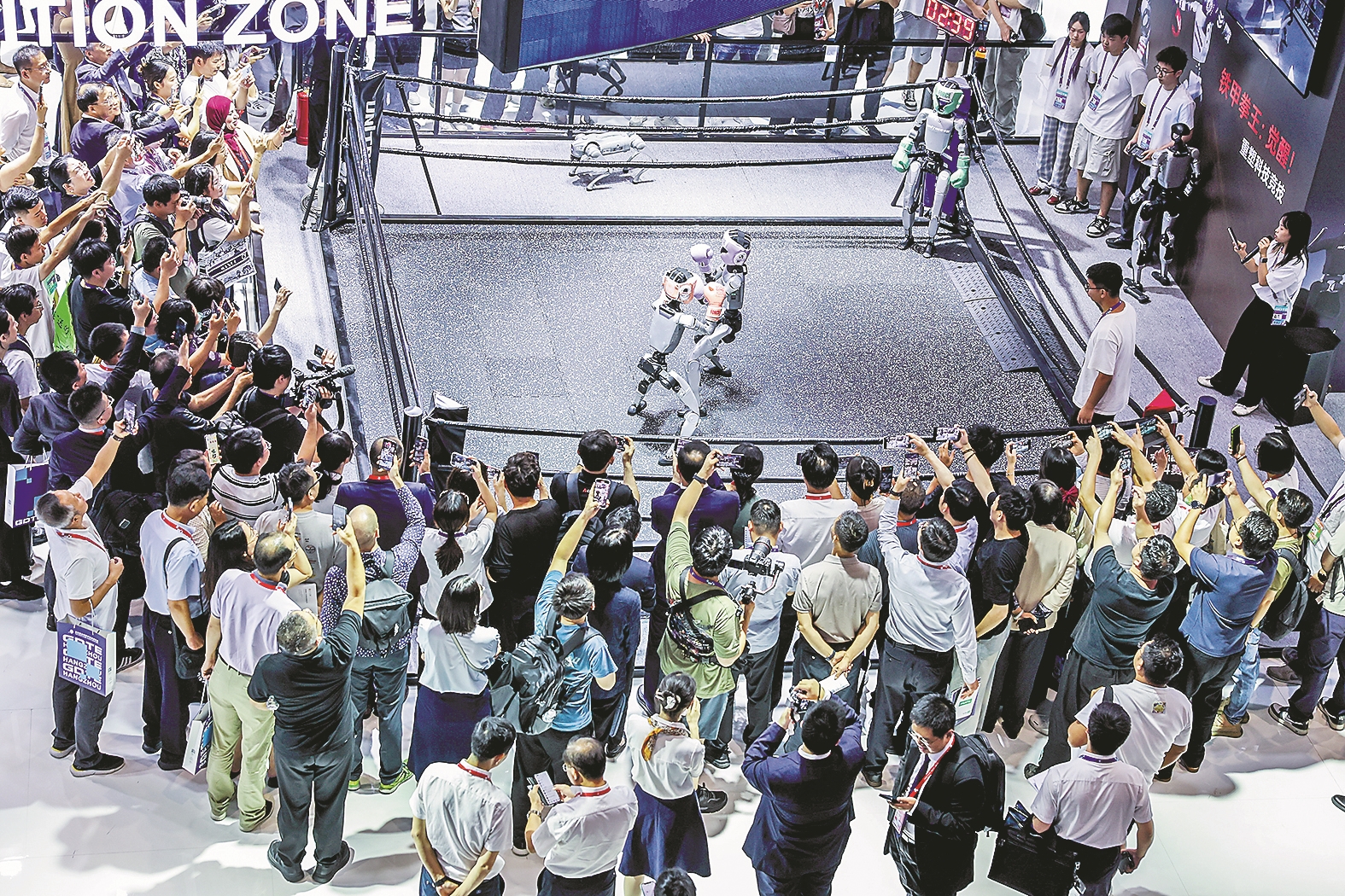 9月25日,在第四届全球数字贸易博览会数智未来主题展区的杭州“六小龙”专区,观众观看宇树科技的人形机器人进行格斗擂台赛。新华社记者 徐昱 摄