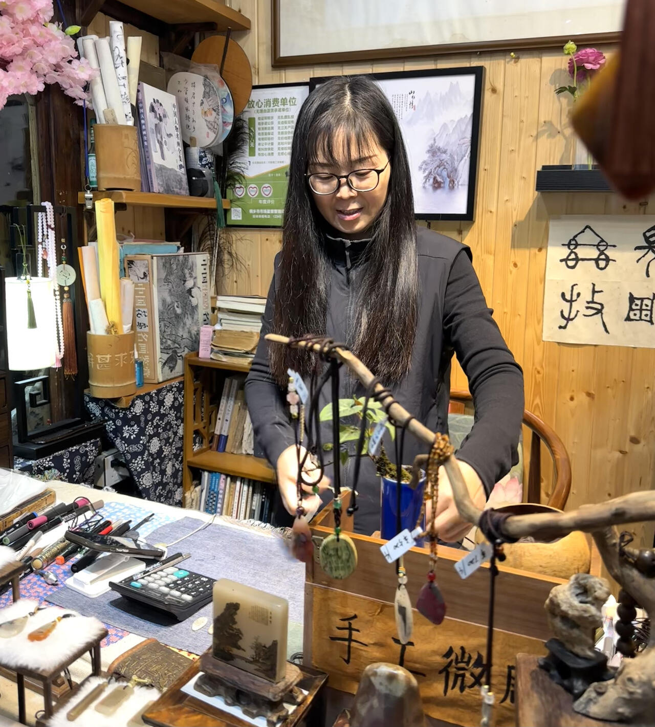 不消几分钟,在几块玉石的轮换间,《庄子》的浪漫,《爱莲说》的睿智,《将进酒》的豪迈,《沁园春·雪》的磅礴都随着徐绿霞的讲述流淌而出,“每一件作品都是独一无二的!”在世界互联网大会永久会址,转角的烟火人间里,藏着文墨翩跹。