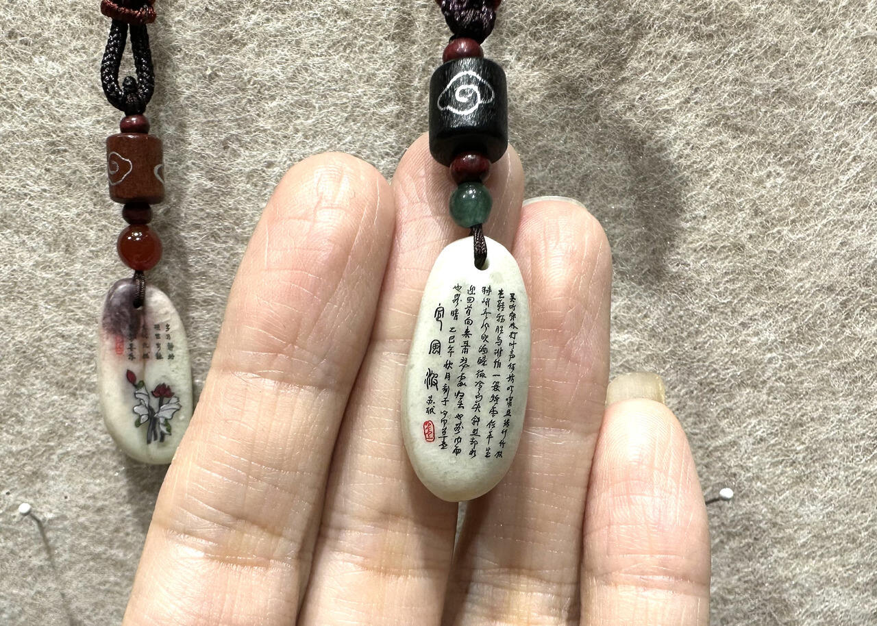 “上面刻了‘得时则蚁行,失时则鹊起’,是《庄子》里的一句话。意思是,人在得意时要像蚂蚁一样稳步前进;失意时则要像喜鹊一样果断行动。”徐绿霞信手捏起一条约2厘米长的象牙白石,借着一枚放大镜,讲起背后的创作巧思,“这块玉石上有一条天然的深色纹理,刚好设计成树枝和喜鹊,末端的黑色,则设计成蚂蚁……”