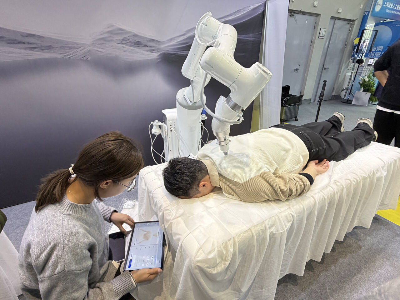 不远处的易启未来展位也排起了长队。今年,他们带来的是智能理疗机器人,一张床配一个理疗机器人,就能让体验者享受到专业级的推拿服务。