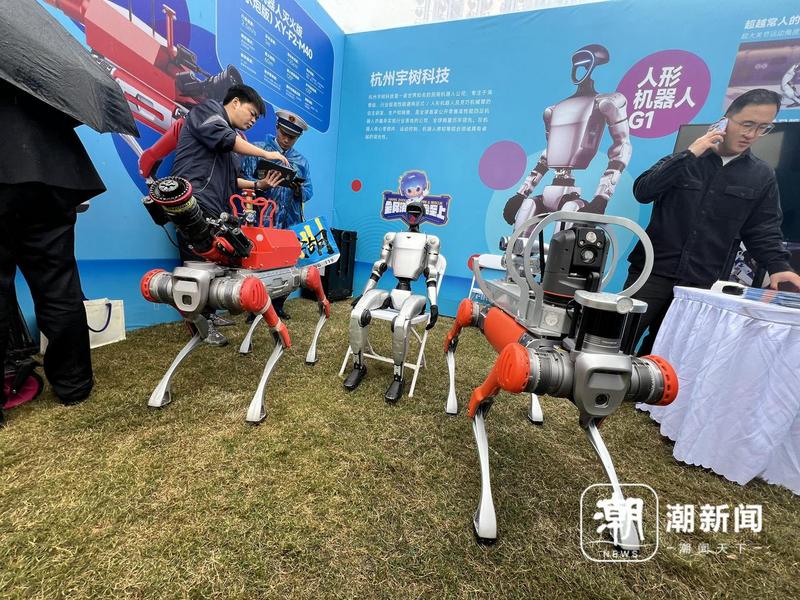 在滨江区消防救援大队的展区前,宇树科技带来两款智能四足机器人——消防侦测机器人和灭火机器人。
