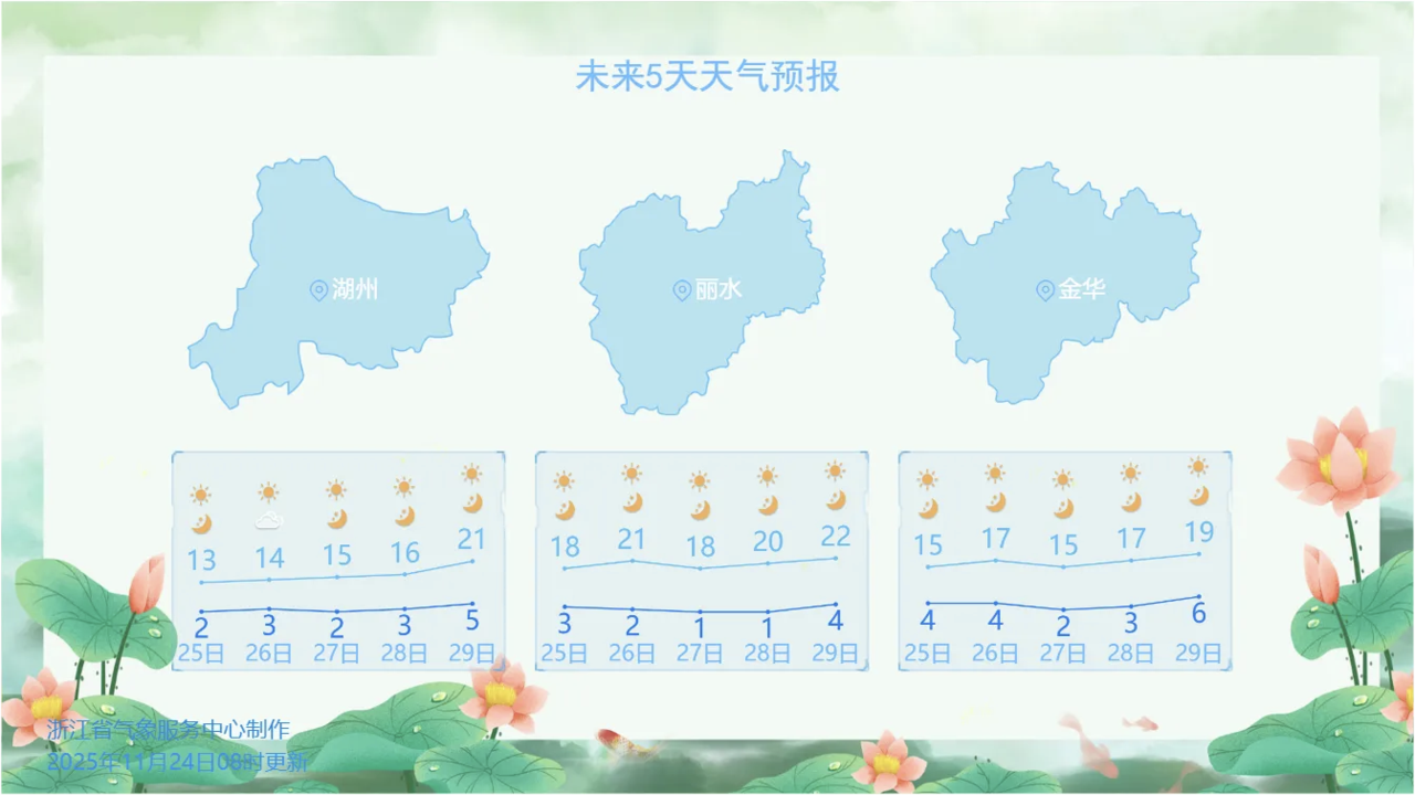 受新一股冷空气影响,自昨天(11月24日)上半夜起,浙江省范围内风力增大。今天,降温区域将快速波及浙北地区,大部地区将降温4-6℃,像是湖州最高气温直接下滑至13℃上下。