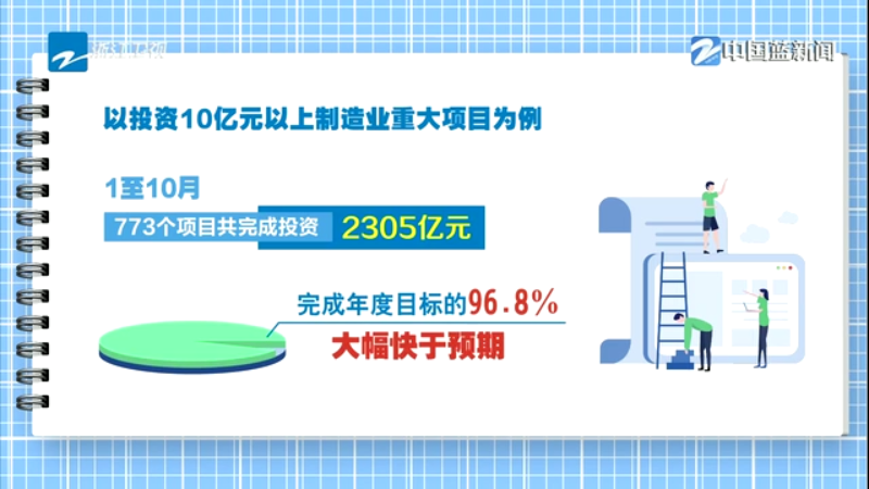 今年以来,全省围绕“415X”先进制造业集群等,持续扩大有效投资。以投资10亿元以上制造业重大项目为例,1至10月,773个项目共完成投资2305亿元,完成年度目标的96.8%,大幅快于预期。同期,旨在提档升级的全省制造业技改投资,也实现了6.8%的较快增长。