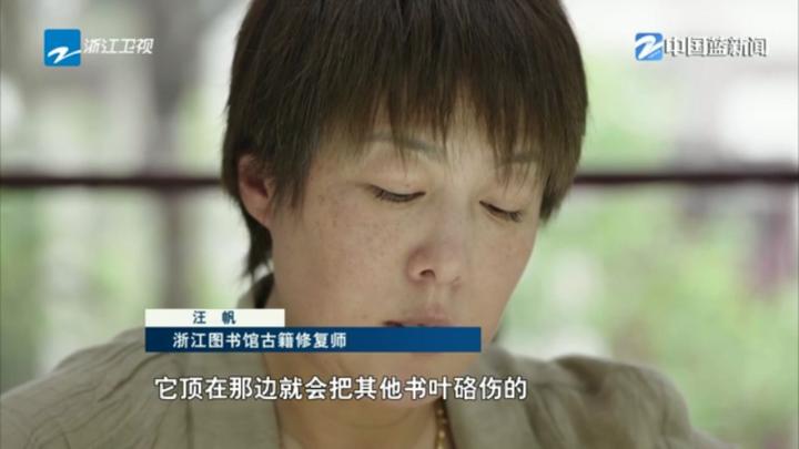 浙江图书馆古籍修复师 汪帆:它一层就是一层,它不平就是定在那边,它顶在那边就会把其他书叶硌伤的,你看着它也不舒服,它自己也不舒服,这就是书知道。