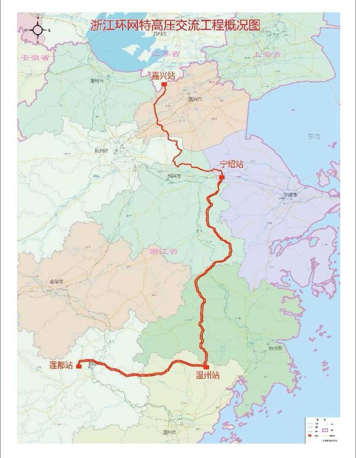 根据规划,浙江特高压交流环网工程将起于嘉兴,途经杭州、绍兴、宁波、台州、温州,止于丽水。全程要新建嘉兴、宁绍、温州三座变电站,扩建莲都1000千伏特高压变电站,新建双回线路长度508.05千米。