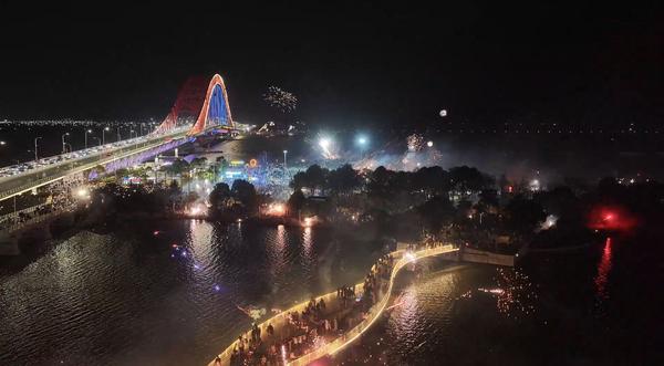 在杭州钱塘江畔,灯光里的人影从2025跑步跨入2026,绚丽多彩的灯光点亮了杭城夜空。