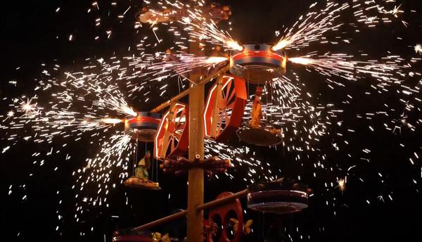 在温州泰顺,被誉为“非物质文化遗产活化石”的药发木偶戏震撼登场。10分钟的表演里,木偶在火药推动下演绎“马跃新元”的古诗,在夜空中攀爬、旋转,花火如星雨垂落,生动演绎出“东风夜放花千树”的东方浪漫。