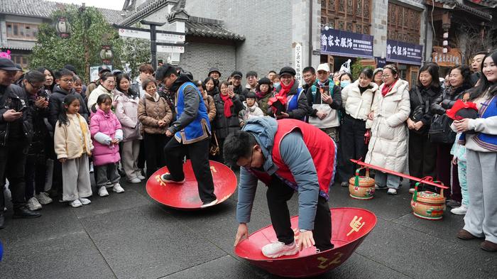 元旦假期首日,丽水处州府城内,“处州十二时辰·秦观的一天”沉浸式体验活动吸引了众多市民游客。在复原的宋代酒税署中,游客跟随由NPC(游戏术语,非玩家角色)扮演的秦观,兴致盎然地核验税银、校对账目、研讨酿酒技艺,切身感受宋代“打工人”的公务日常。体验过后,还能移步至署外小吃摊,品尝甜酒酿、油桶饼、米醋拌等地道风味,让舌尖延续穿越之旅。