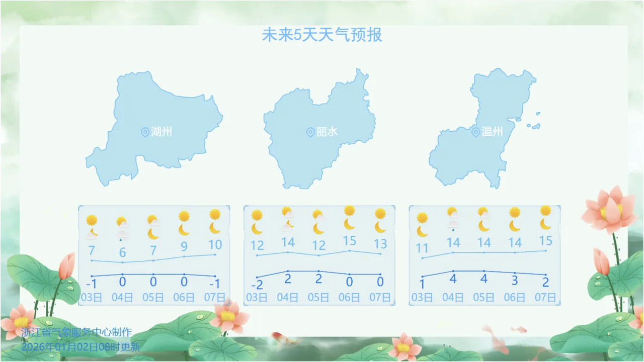 据浙江省气象台监测,昨天(1月2日)全省最冷的是湖州,最高仅为3.5℃。整体来看,浙北地区大部在4~8℃,浙南和东南沿海地区地区8~12℃,其它地区6~10℃。加上大风带来的风寒效应,是典型的晴冷天。
