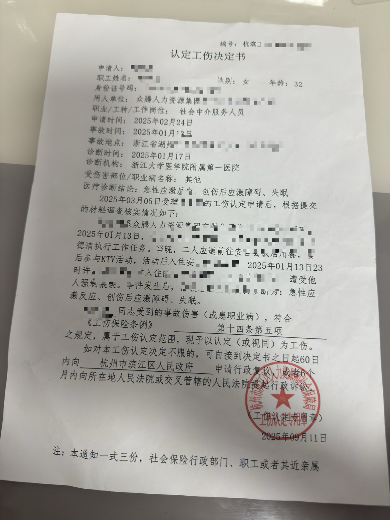 刑事部分看似告一段落,但对魏莹而言,另一场更为漫长、煎熬的抗争才刚刚开始——2025年9月,杭州市滨江区人力资源和社会保障局认定,魏莹在事发后所患的“急性应激反应”和“创伤后应激障碍”,属于工伤。这让她成为全国范围内,已知的第二例因精神损伤被认定为工伤的女性劳动者。