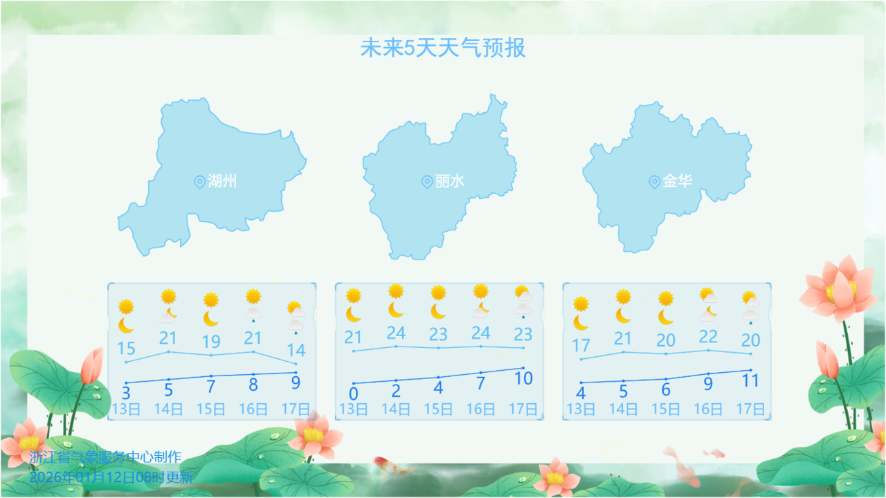昨天(1月12日),上周六开始影响浙江的这股冷空气趋于结束,浙江人在经历了寒意十足的早晨后迅速迎来气温回升。昨天午后,最高气温均升至10℃以上,到16时,最高气温浙中北11-15℃,浙南地区13-17℃,最高文成和云和为17.9℃。
