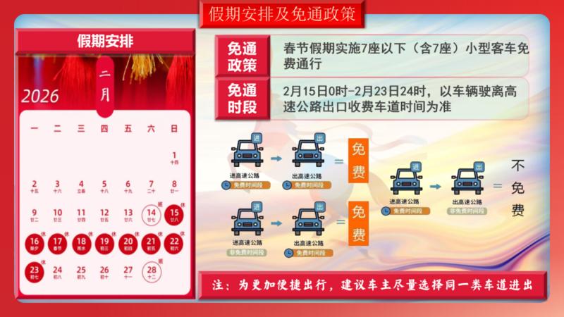 2月15日0时至23日24时,全国高速公路将对七座及以下小型客车,免收车辆通行费。