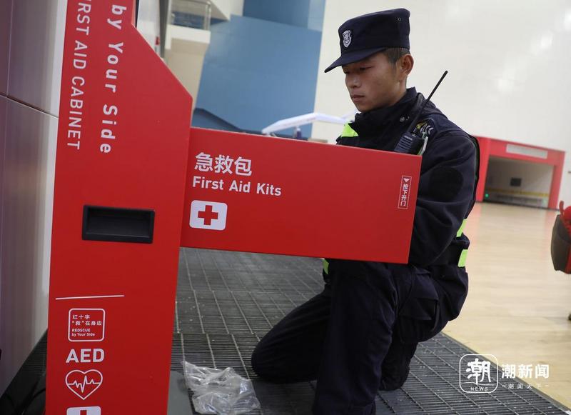 检查场馆AED等应急救援设备。潮新闻 记者 汪驰超 摄