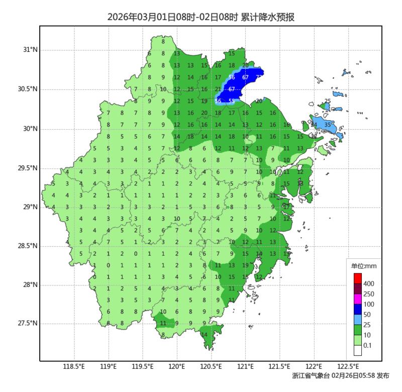 这场雨不仅量大,持续时间还长。从前天(25日)夜里开始,全省各地普遍有中到大雨,浙西局地甚至达到了暴雨量级。据省气象台监测显示,截至昨天(26日)18时,衢州、湖州面雨量超过20毫米,开化县以34.9毫米位列全省区县首位。