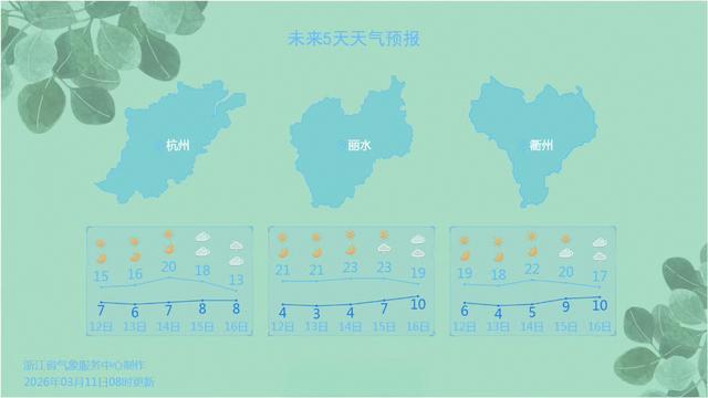 像是杭州,3月12-15日白天最高气温在16-20℃之间。但是昼夜温差加大,早晚偏凉,大家穿衣可以采用洋葱式穿搭,方便随时增减,避免着凉。