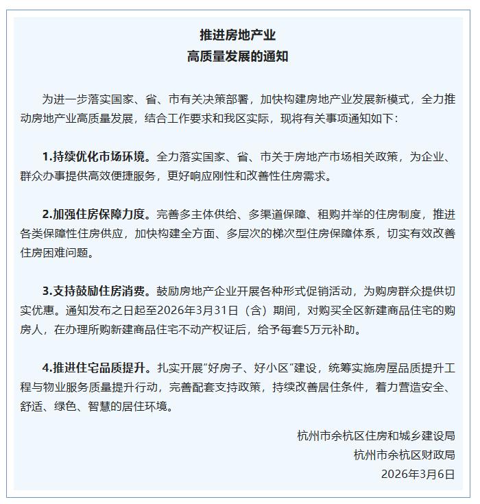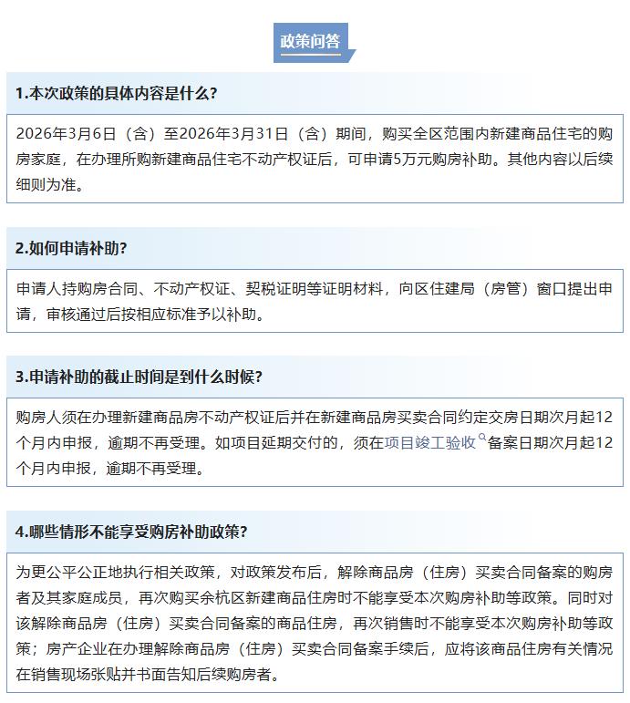 即日起至2026年3月31日(含)期间,对购买余杭区新建商品住宅的购房人,在办理所购新建商品住宅不动产权证后,给予每套5万元补助。