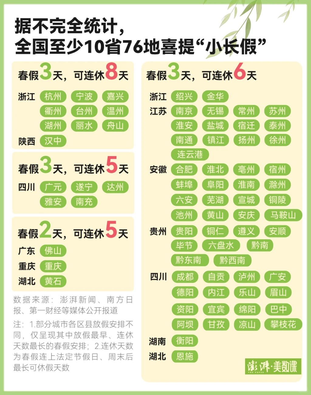 比清明节更早到来的,是中小学生的春假。据不完全统计,全国至少10省76地喜提“小长假”,有的与清明相连,有的则和五一假期相接。