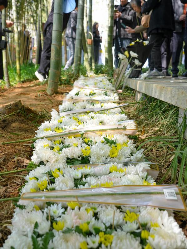 伴随着悠扬琴声,9位生态葬践行者的骨灰被轻放于竹林深处,覆以竹叶、花瓣与土壤,并奉上一杯清茶,生命以其最纯净的形态,最终完成了“尘归尘,土归土”的本真回归。4月2日,安吉县第十二届“竹之韵”公益生态葬活动在安吉龙山源举行。作为浙江首个开展竹林生态葬的地区,安吉迄今已有154位逝者选择以这种生态、文明的方式,与青山翠竹相伴长眠。
