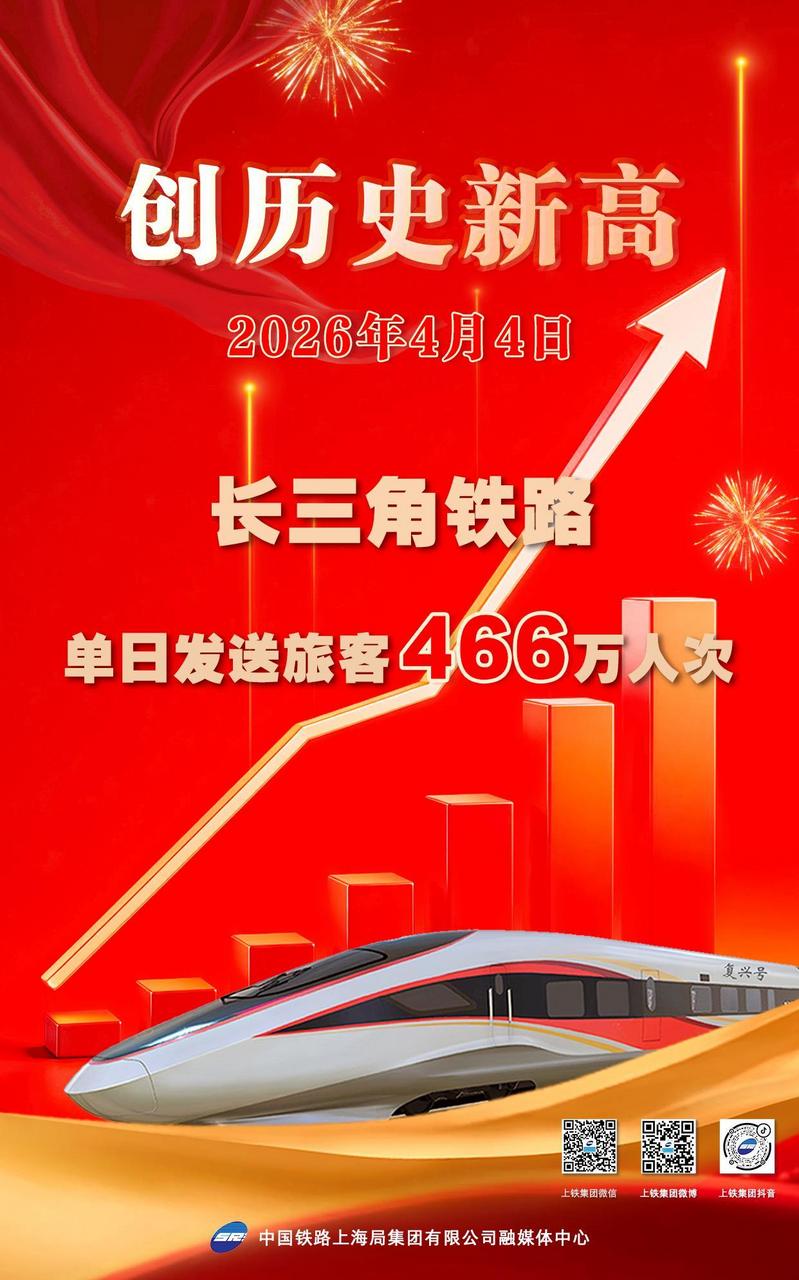 4月4日,潮新闻·钱江晚报记者从中国铁路上海局集团有限公司(以下简称“上铁集团”)获悉,长三角铁路当日发送旅客466万人次,超过2025年5月1日单日发送旅客426.8万人次的最高纪录,创单日客发量历史新高。