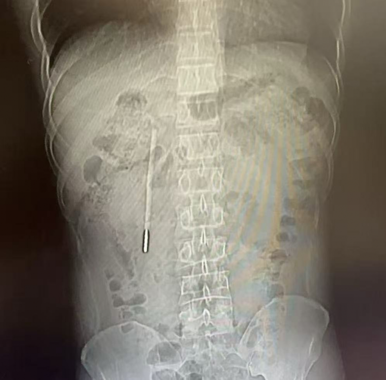 32岁的王先生最近腹部消化不好,前往温医大附一院龙港院区就诊。该院区医生对其做腹部CT检查,发现其十二指肠处有异物,高度怀疑是水银体温计,前端已抵在肠壁上,随时可能引发穿孔、大出血等严重后果。追问病史后得知,这根体温计是王先生12岁时不慎误吞的,当时因害怕不敢告知家长,其家长忙于工作疏于看管,而王先生的身体也没出现异样,也就没把此事放在心上。