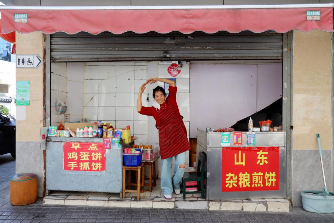 在自己的蛋饼店前随着节拍起舞,